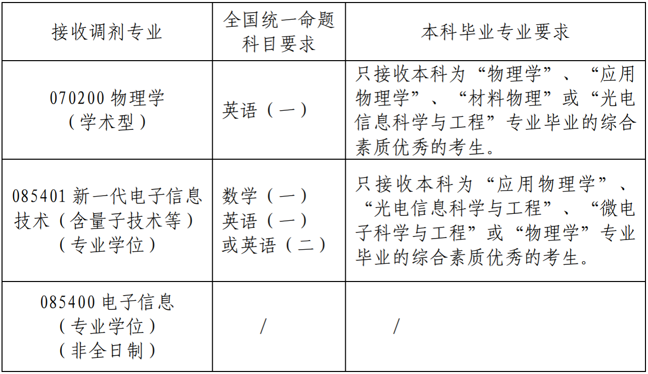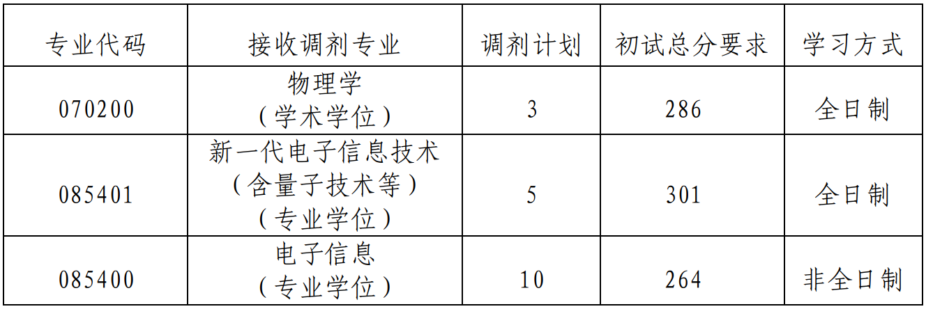 3.调剂考生第一志愿报考专业与调入专业相同相近,初试科目与调入专业初试科目相同相近。调剂070200物理学、085401新一代电子信息技术(含量子技术等)专业的考生第一志愿报考学习方式应为全日制。