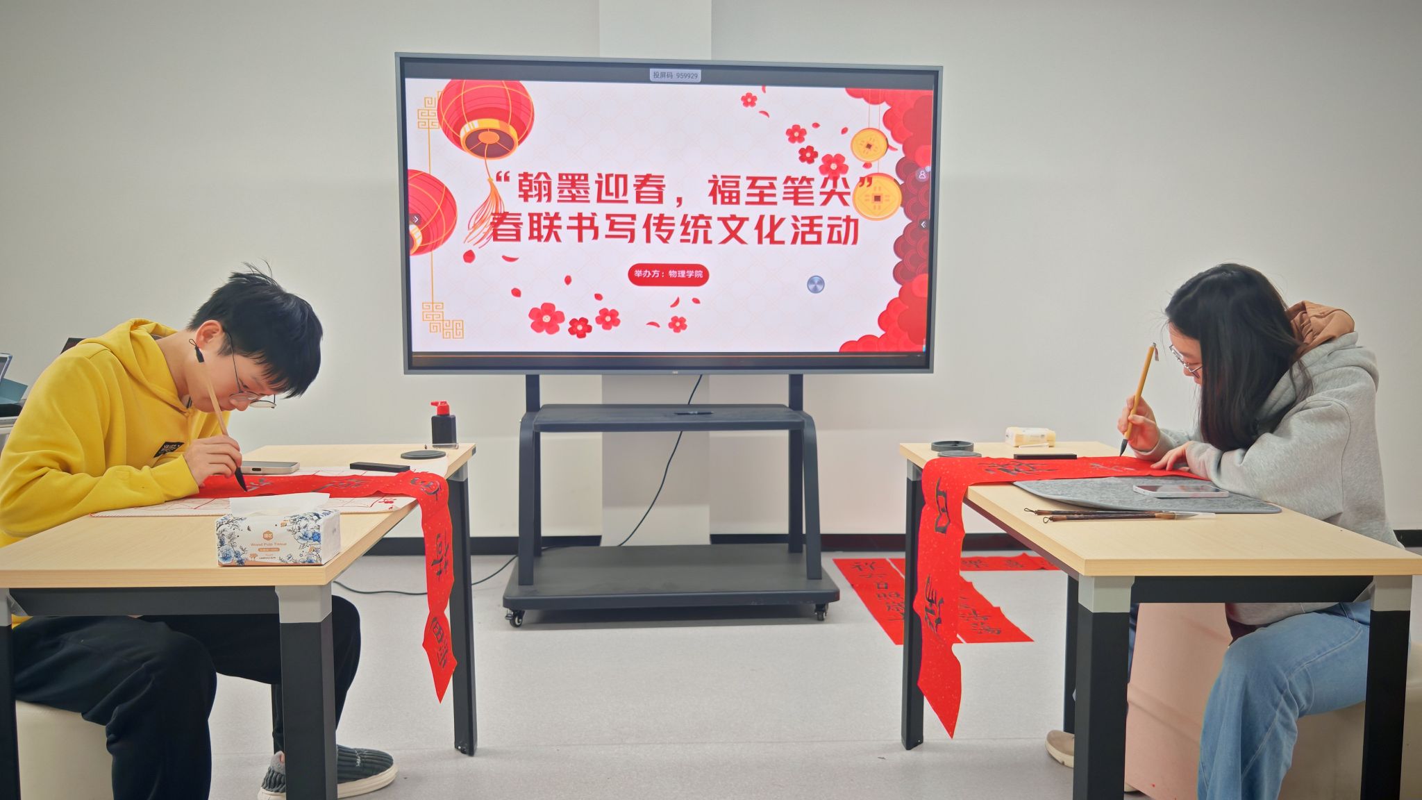 为弘扬中华优秀传统文化,营造喜庆祥和的新春佳节氛围,丰富学院学生的文化生活,1月18日下午,物理学院“翰墨迎春,福至笔尖”对联书写活动在4号宿舍楼学生社区沙龙空间圆满举办。活动吸引了众多同学踊跃参与,大家执笔挥毫,在墨香中共迎龙年新春。