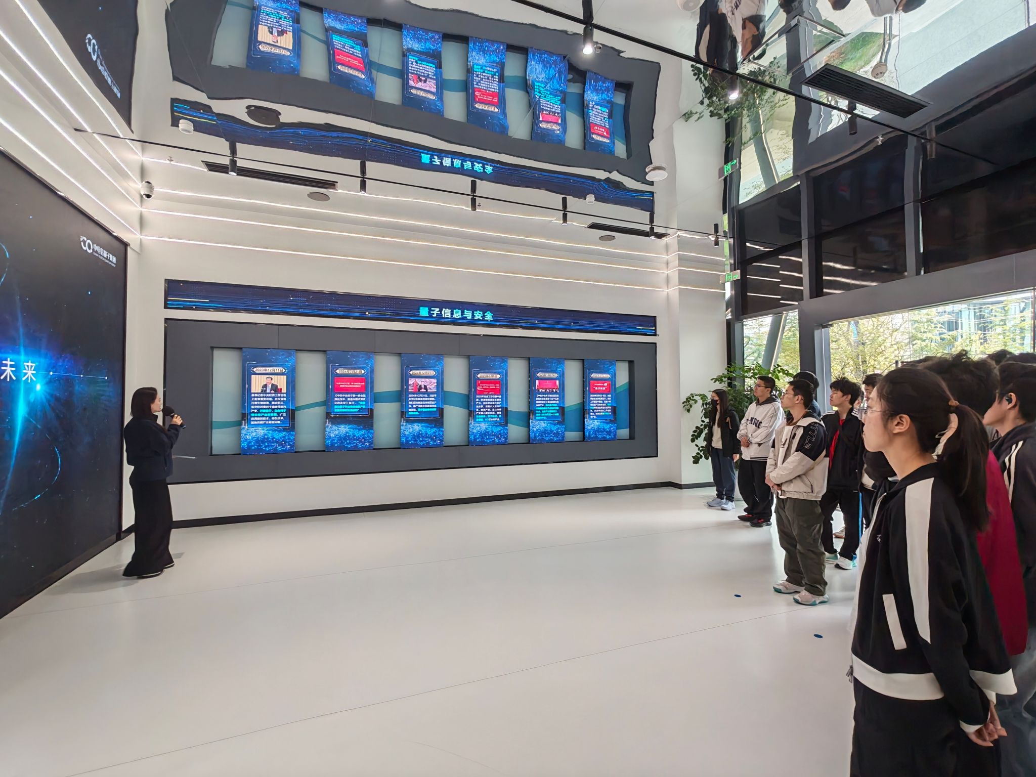 中电信量子集团作为量子科技与产业发展“国家队”,自2023年成立以来,已推出30多款“量子+”产品,覆盖医疗、制造、政务等多个行业,应用于真实场景,彰显量子科技产业化力量。在工作人员的引导下,同学们先后参观了量子科技展厅及成果展示区。展厅内,国内单台比特数最多的量子计算机——天衍504彰显着“国之重器”的威严,合肥量子城域网的大屏上展示着量子网络加密之下数据资料的流向。企业技术专家结合自主研发的量子计算机量子安全解决方案、量子密钥分发等核心成果,深入浅出地讲解关键核心技术突破背后的奋斗历程,生动诠释了科技强国的使命担当。同学们认真聆听、积极提问,围绕量子科技发展前景、产学研协同创新等话题与专家进行深入交流。同学们纷纷表示,通过实地走访真切感受到国家在量子科技领域的战略布局与硬核实力,更加坚定了投身基础研究、服务高水平科技自立自强的决心。