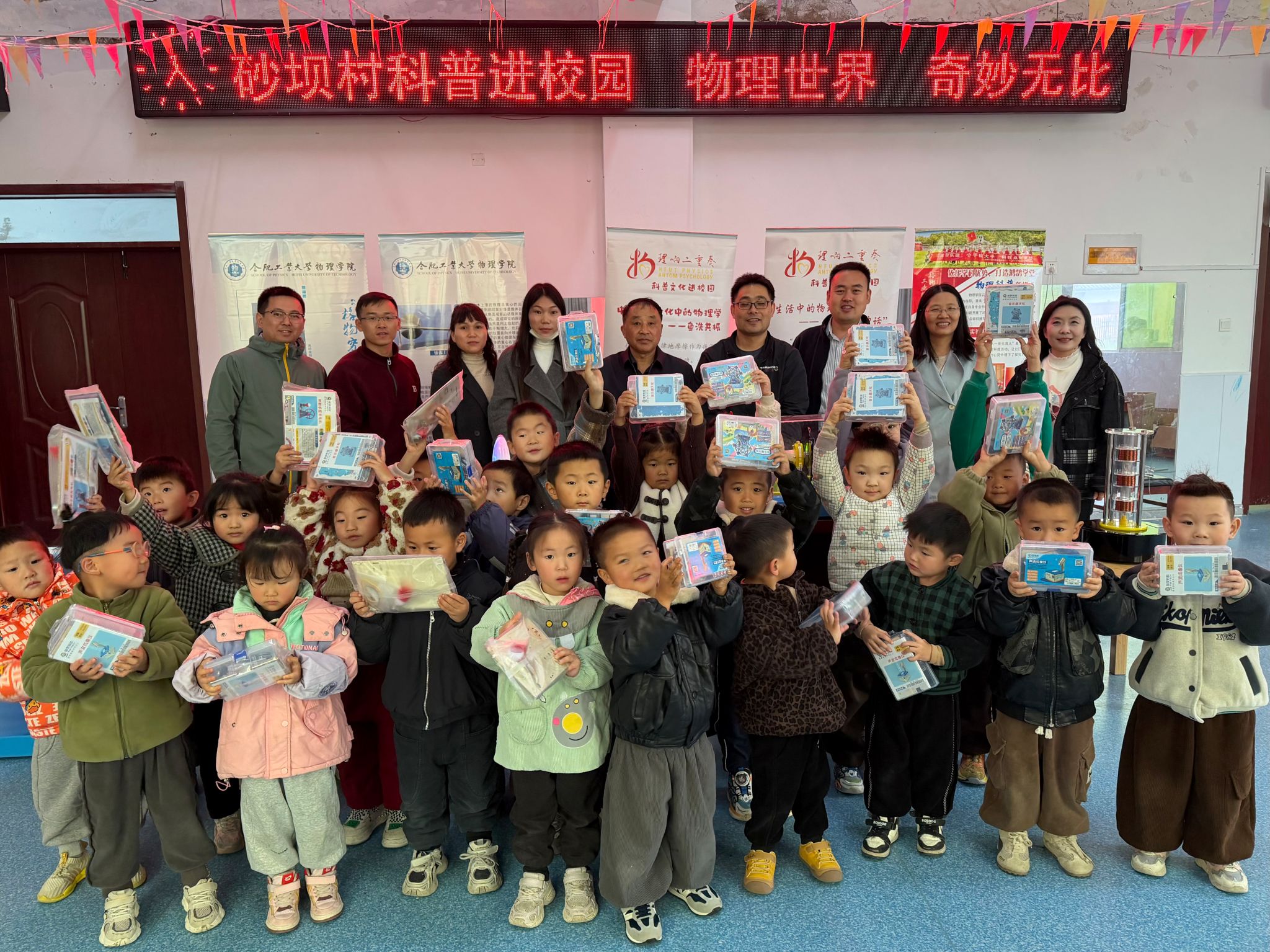 与此同时,物理学院发挥自身优势,组织党员教师代表走进砂坝村幼儿园,开展了以“物理世界,奇妙无比”为主题的科普进校园活动,并赠送了趣味科学实验器材。通过互动式、体验式的教学方式,带领孩子们亲手操作了电磁感应、视觉暂留、人体电流计等一系列简单、有趣、安全的物理小实验,在孩子们幼小的心灵里播撒下了热爱科学、勇于探索的种子。