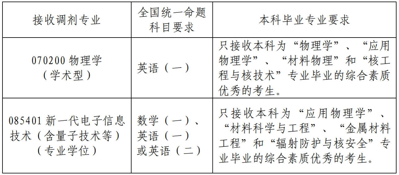 聚变科学与工程学院依托物理学院070200物理学、085401新一代电子信息技术(含量子技术等)专业招生,现接受考生调剂,欢迎符合条件考生报考。